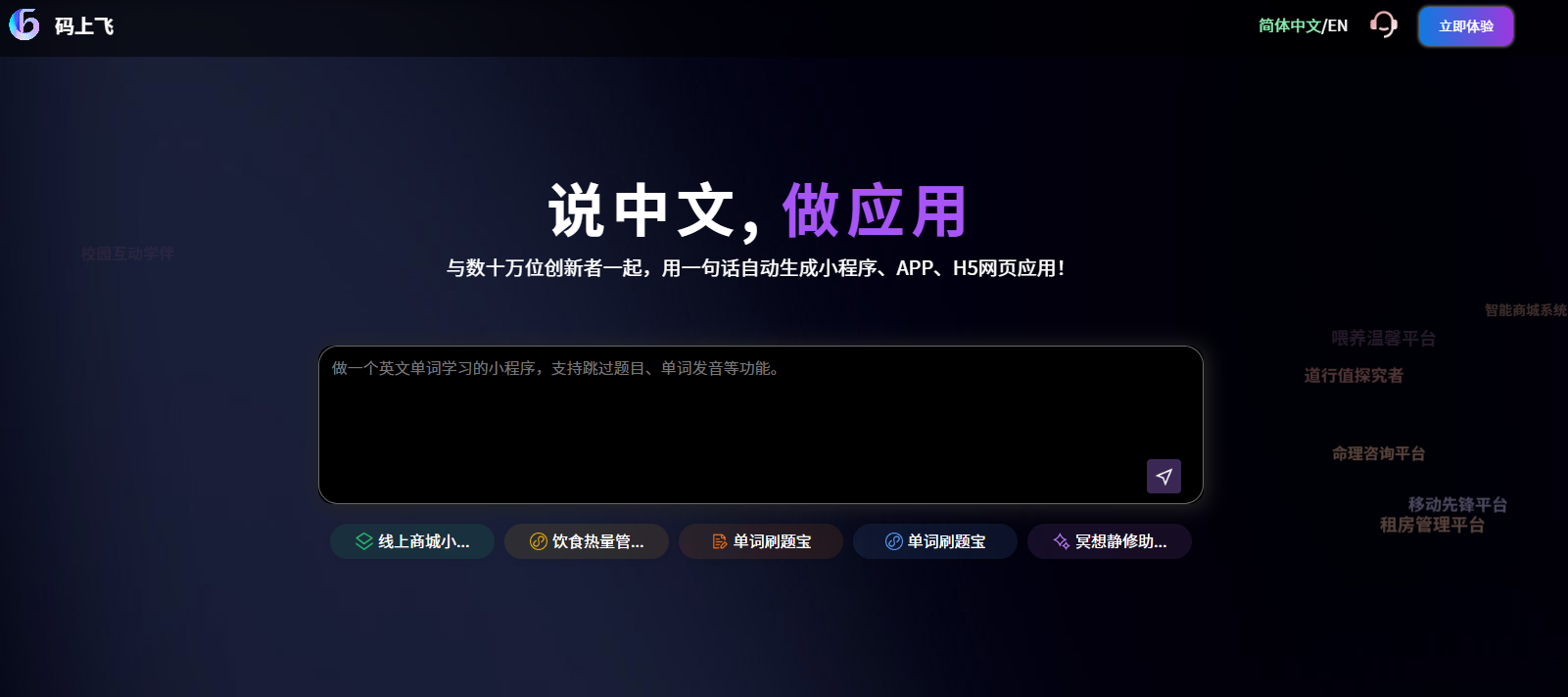 CodeFlying-码上飞是一款革新性的智能应用开发平台,致力于让应用构建像说话一样简单。用户通过自然语言描述需求,平台即可智能生成功能完备的小程序、APP和H5网页应用,大幅降低开发门槛。平台已汇聚数十万创新者,共同实践高效、智能的应用创作新模式。